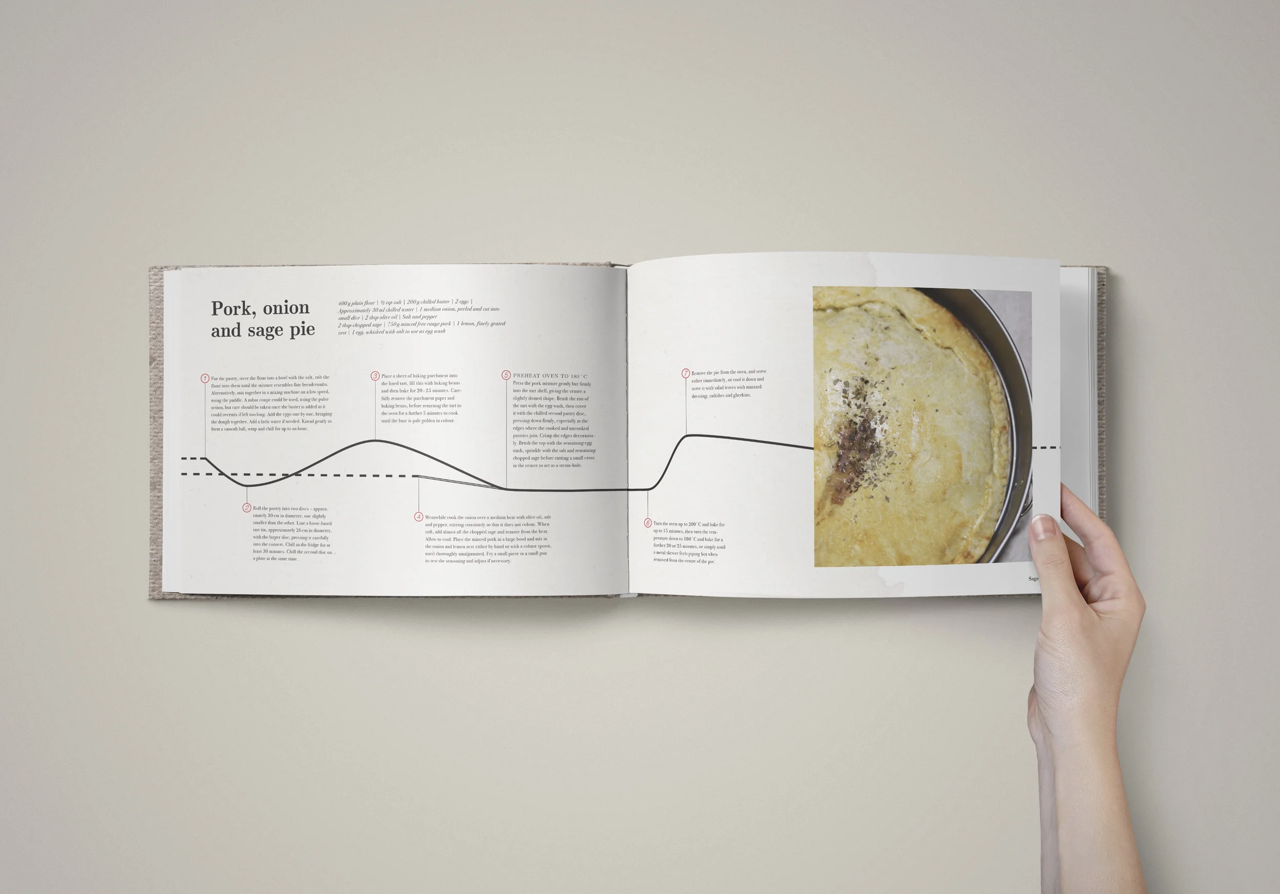 After all, cooking is not an activity that is compact and done in a blocky and compressed manner; following a recipe takes time and space from beginning to end, as well as a lot of breathing room in between steps. Thus, following the principles of slow design, recipes are turned into timelines, with steps labelled from left to right on spreads.