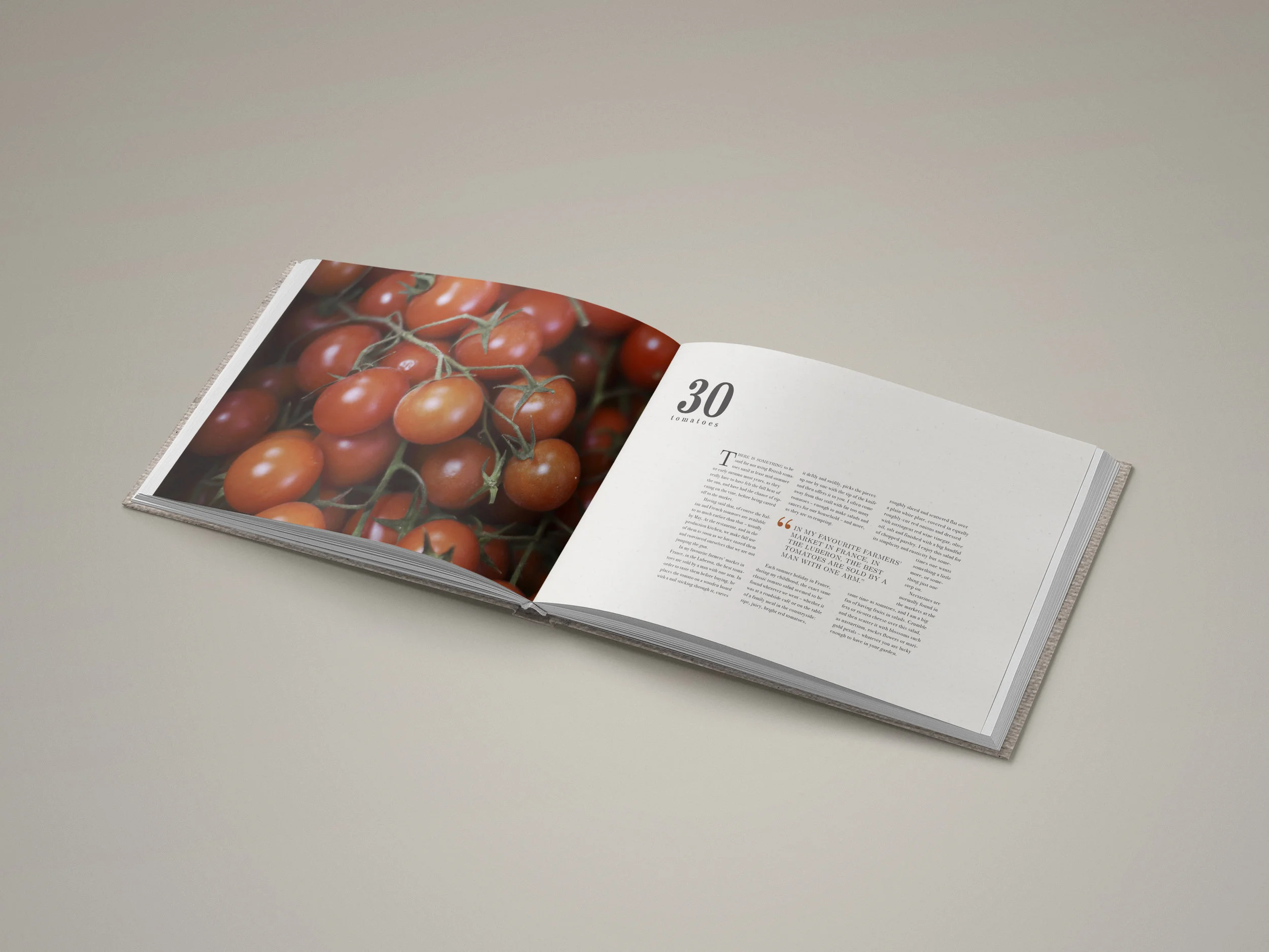 Logos for each ingredient, in the same style as the title of the book on the front cover, are placed in the same position on the page—a way of keeping continuity and coherency, as well as simplicity. The two-digit number indicates which ingredient it is on the list of Clarke’s 30 ingredients. Pull quotes are also added on several ingredient pages for more dynamism in the layout, with the colour of the opening quotation mark always the same as the colour of the ingredient.