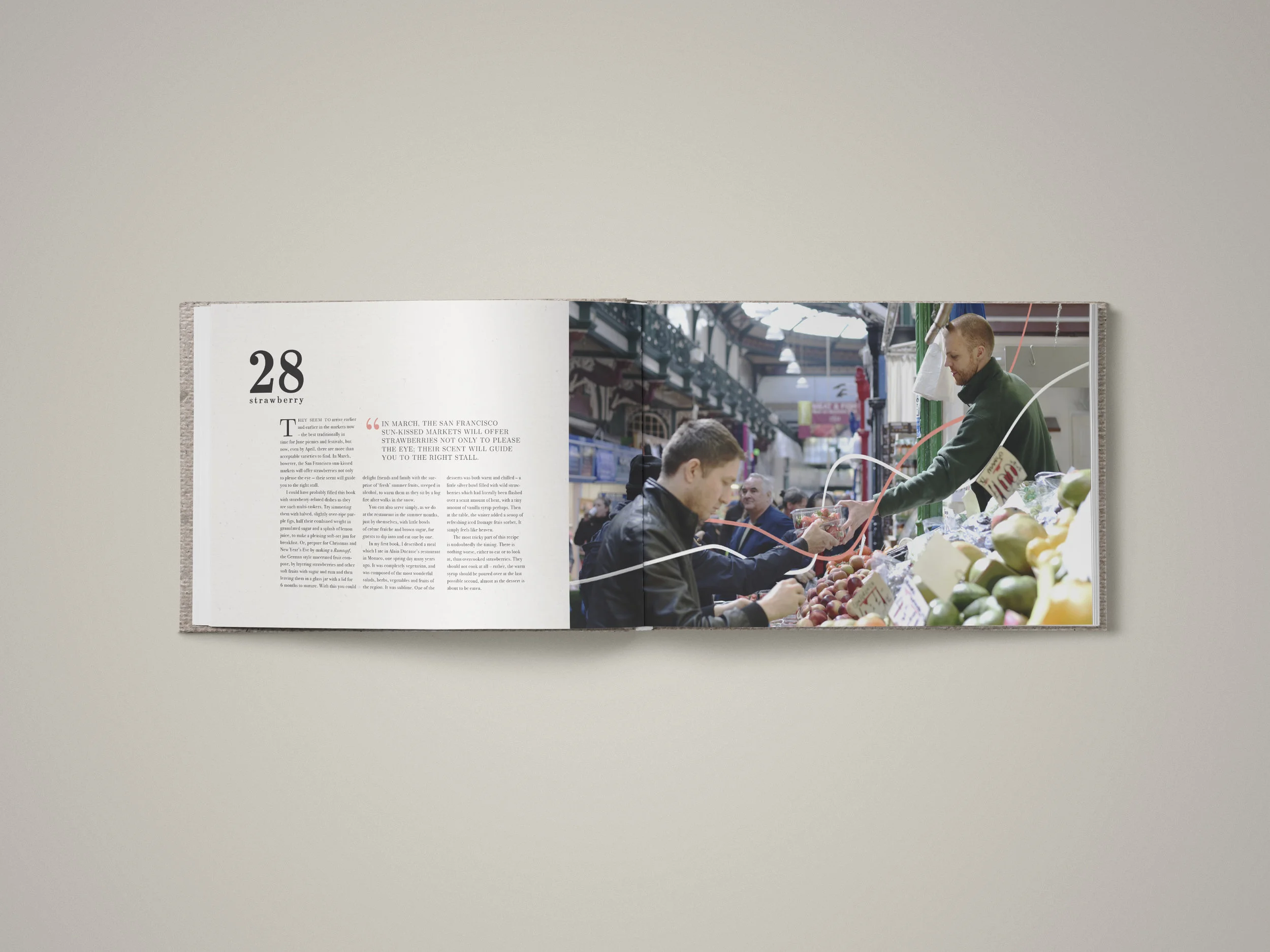 However, our food is not created in a vacuum; there are many factors to food production that have to do with people, places and politics. By including a fair amount of environmental portraits of real vendors at markets, an honest human element to cooking is brought to light. The motif of horizontal connecting lines continue physically through these market scenes, showing the important connection between food, the people they come from, and the people they go to.